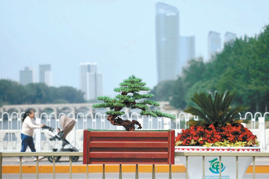 城市副中心总长度21.5公里的“花香大道”今年再添新景观。一株株苍翠挺拔的小小迎客松傲立街头,努力伸展的枝干如同张开的长臂,喜迎四方宾朋。记者日前从通州区城管委了解到,“花香大道”首次采用时令花卉与造型盆栽组合的形式,共设置立体花箱5100余个,为城市副中心增添一道道赏心悦目、生机盎然的风景线。