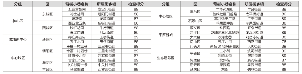 依据“背街小巷检查得分90分以下给予降档”的原则,第一季度全市共有28条背街小巷得分在90分以下,降为不达标类街巷。其中东城、西城、朝阳、丰台区各3条,通州、海淀、石景山、平谷区各2条,顺义、昌平、大兴、房山、门头沟、怀柔、密云、延庆区各1条(详见附件)。