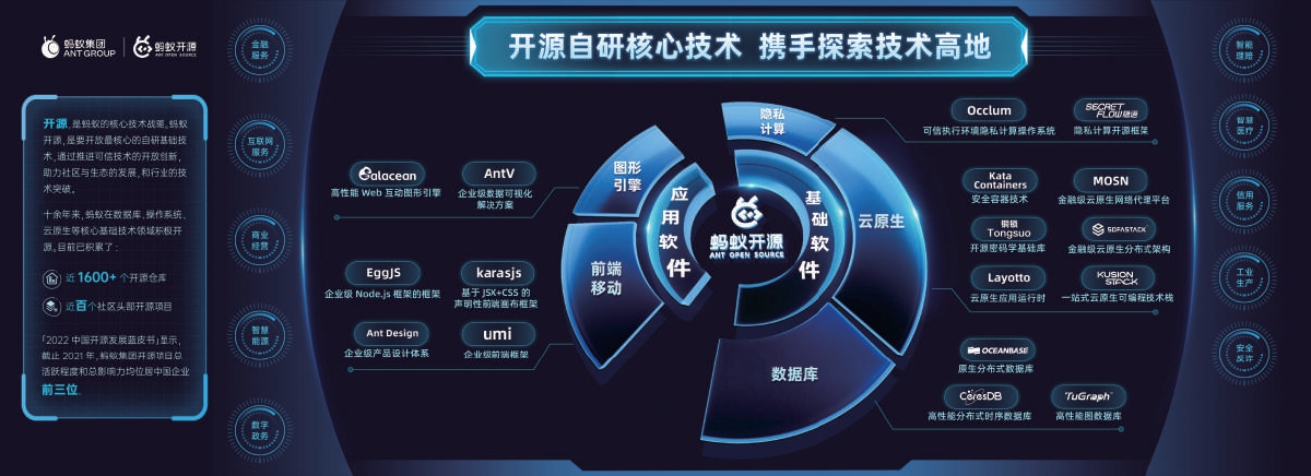 如今,蚂蚁集团将这个理念带到了中关村论坛。2023年度中关村论坛的主题为“开放合作·共享未来”。蚂蚁集团以“开放自研核心技术,携手探索技术高地”为主题参加展会,并首次披露蚂蚁的整体开源版图和9大核心开源项目。从蚂蚁集团的开源版图和核心开源项目中,可以清晰看出蚂蚁集团一直以来贯彻的理念——聚焦基础软件技术,通过积极开源来推动国内基础软件技术整体进步,并为国内技术人才的培养提供更多动力。