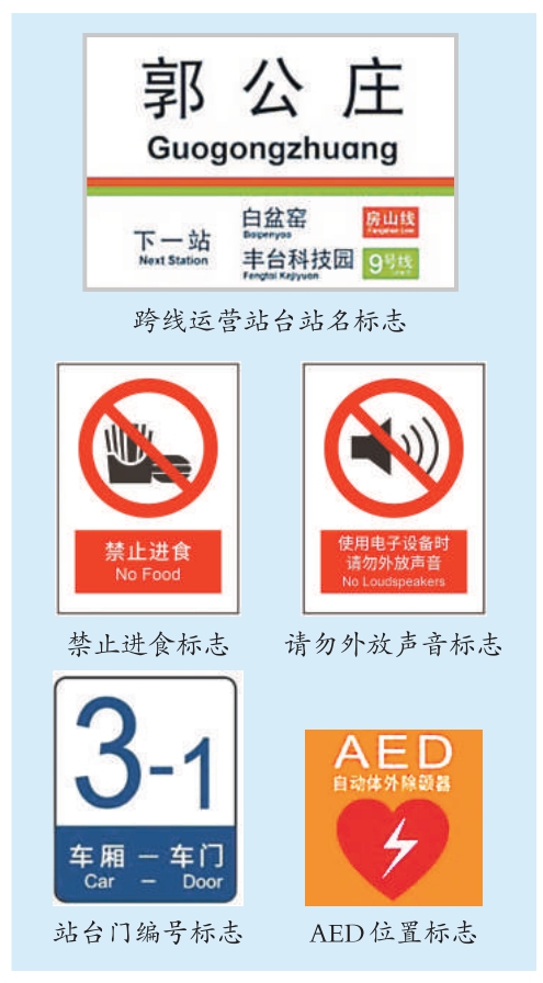 意见稿中不仅增加了第三卫生间、母婴室、AED位置标志示例,强化车站服务功能,还新增了站台门编号、跨线运营等标志。此外,请勿外放声音等禁止行为也有了特定标志。