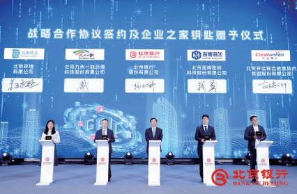 此次活动现场,在参会嘉宾的共同见证下,北京银行发布“GBIC2组合金融方案”“英才金融服务方案”和“赞”信用卡品牌,与北京股权交易中心有限公司、中国技术交易所有限公司等14家企业现场签署战略合作协议,并向签约企业赠予北京银行“企业之家”钥匙。