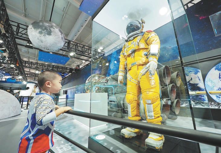 北京首钢园2023中国科幻大会·潮幻奇遇季互动展上,科技感满满的航天服展品吸引了小朋友的目光。本报特约摄影 杜建坡