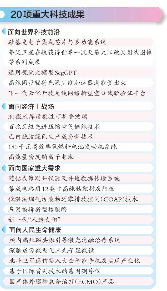 5项面向世界科技前沿的成果,大多在各自领域取得“零的突破”。比如,2022年10月9日,中国首颗综合性太阳探测卫星“夸父一号”成功发射。在轨测试期间,科研人员获得一系列重要科学观测成果。其中,全日面矢量磁像仪(FMG)首次实现我国在空间开展高时间分辨、高精度的太阳磁场观测,所获取的太阳局部纵向磁图的质量达到国际先进水平;太阳硬X射线成像仪(HXI)首次实现我国对太阳硬X射线成像,是目前唯一提供地球视角太阳硬X射线图像的专用设备。再比如,北京智源人工智能研究院发布的通用视觉大模型SegGPT,是国际上首个利用视觉提示完成任意分割任务的通用视觉模型。