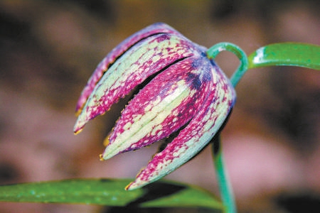 轮叶贝母,属于百合科内最大的家族——贝母属,主要分布在东北至华北地区,生长于高海拔山坡草地或林下。小小的花朵宛如一盏垂吊的宫灯,走近细看,每朵花的被片上散落着方块状的紫色、红色和绿色色斑,犹如马赛克一般,十分奇特。而在被片的内侧,挂着晶莹剔透的花蜜,甜度可比得上蜂蜜。