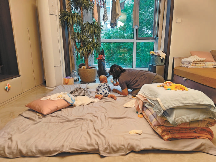 不堪电梯噪声的困扰,任先生爱人和宝宝每天只能在客厅打地铺睡。