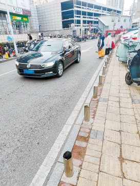 让人揪心的是,破损阻车桩顶部的豁口直接裸露在外,有的地方还比较尖锐。记者注意到,紧挨着阻车桩的就是盲道,空间比较狭窄,不少行人只能贴着阻车桩走,而且很多想要过马路的行人也都会由此经过,存在着一定的安全隐患。一位女士说,去年夏天她经过时,由于没注意到阻车桩已经破损,贴得又比较近,导致小腿被划伤。