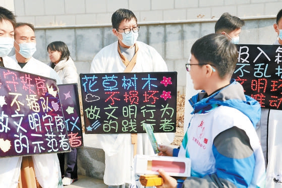 本次活动还在地铁站旁设置了游客互动分会场,在“文明彩虹桥”涂鸦墙区域,志愿者、游客可以签名并许下文明旅游承诺;在“文明造梦厂”区域,微型景观沙盘中摆有“迷你人偶”,游客可以动手挑出踩草地、乱扔垃圾、车辆乱停乱放等代表不文明行为的人偶,还原景区文明景象。本报记者 白继开摄