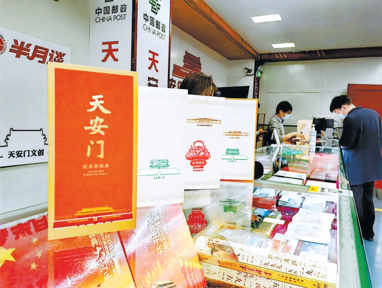 邮局内设立了服务专台销售《天安门》个性化服务专用邮票、首日封、邮折等,并在现场提供盖戳服务。记者看到,柜台里还展示着《庆祝中国共产党成立100周年》纪念邮折、《中国共产党历史展览馆》《爱我中华盛世国典》等邮品。一本《天安门纪念邮戳集》最为亮眼,游客游览完天安门,可以在邮戳集上加盖人民大会堂、毛主席纪念堂、正阳门、国博、祝福祖国大花篮等多枚游览地纪念戳,并在邮票上加盖“天安门”日戳,庄重地完成打卡。