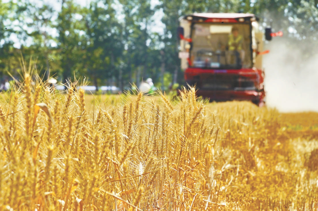 在五环边将台乡的自然里生态农场,金色的麦芒随风摇曳,麦秆上挑着沉甸甸的麦穗。大型收割机在田野里往来穿梭,开足马力收小麦。