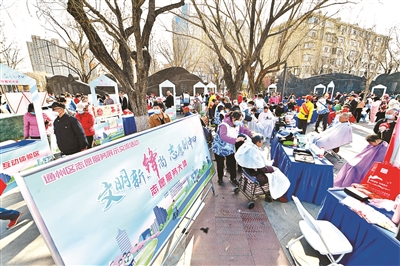 据介绍,学雷锋志愿服务大集分为政策咨询、便民服务、应急培训、互动体验、激励回馈、志愿者招募六个板块,通州区“9+N”类区级志愿服务总队百余名志愿者“组团出道”,70余个服务摊位纷纷“开摊”,现场为群众提供了45项服务和体验。