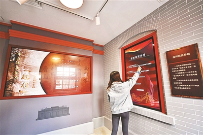 继续往里走,有两间独立的小房子,每间面积仅有十余平方米。布展时将其打造为影音体验区和书籍体验区。走进影音体验区,正对门口的墙面上有一块互动大屏,滚动播放与中共中央进京“赶考”相关的10部影视资料,包括《列车晚点》《西苑阅兵》《颐和园益寿堂晚宴》等,每段视频大约1至3分钟。其中有一部沙画作品,通过动漫的形式回顾了中共中央进京“赶考”的历史征程,让观众眼前一亮。