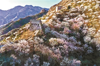3月27日,北京怀柔烂漫的春花和蜿蜒的河防口长城相映成趣。