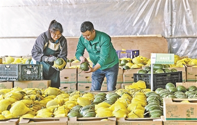 昨日,北京市大兴区庞各庄镇政府和电商平台联合举行了“头茬西瓜上市电商助力增收”的上市发车仪式,3000多个凌晨采摘的头茬西瓜通过冷链运输送到消费者手上。今年,庞各庄镇首次发放“西瓜溯源码”,市民可扫码了解西瓜产地、育苗来源等信息。图为瓜农和电商平台采购员在检查头茬西瓜品质。