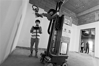 值得一提的是,该项目还在现场三栋单体建筑中选取一栋作为智慧施工的进一步试点,在二次结构和装修阶段的施工过程中全部都派出机器人上场。北青报记者在一处房间内看到,一个粉色的喷涂机器人正在忙碌:接收到操作指令后,机器人先是向正前方的墙面移动,使用激光雷达扫描,定位与墙面的距离,随后抬起“手臂”,对着墙面开始喷涂。一面18平米的墙喷涂下来只需3分钟,而传统人工操作则需要15至20分钟的时间。在旁边的房间里,有的机器人在涂敷腻子,有的在平整地面,还有的在熟练地贴地砖……“这里一共使用了7种机器人,分别是地面找平阶段的整平机器人和磨光机器人,以及装修阶段负责墙面抹灰、打磨、喷涂料、喷腻子等工序的5种机器人。”李飞介绍。