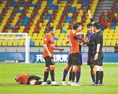 ▲主裁判艾堃(右一)向上海申花队球员朱辰杰(右三)出示黄牌