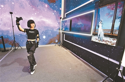 在元宇宙展台,工作人员正在展示如何像电影《头号玩家》角色一样,体验数字虚拟世界的场景。