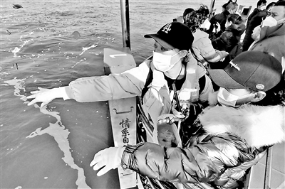 昨日上午9时30分许,“国宾9号”海葬专用船缓缓驶出码头,前往指定海域。逝者家属怀抱着亲人的骨灰,做最后的告别。“起伏的波涛,运载着亲人的寄托;美丽的浪花,奏出了永恒的旋律。”到达指定海域后,骨灰海葬告别仪式开始,在礼仪人员的引导下,逝者家属来到甲板,伴着红色的玫瑰花瓣,轻轻将亲人骨灰送归大海。王女士的父亲是一位老党员,生前留下遗愿,希望将骨灰撒入大海。“父亲生前说,骨灰撒海不占用土地,也算是为生态环境做了一点贡献。”