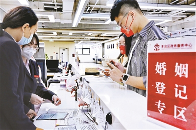 昨日起,本市正式实施“跨省通办”婚姻登记业务。当日上午8时,全市首张“跨省通办”的结婚证书在丰台区婚姻登记中心颁出。6月1日当天,全市婚姻登记“跨省通办”预约人数达到222对。详见A4版摄影/本报记者魏彤