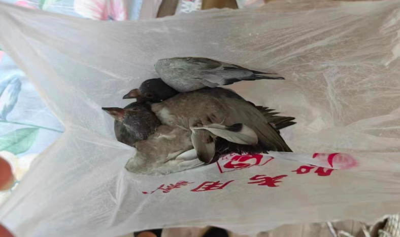 社区连忙联系了相关部门,专业人士做好安全防护后,踩着约20厘米宽的楼板外沿,小心翼翼地从空调外机和楼体夹缝中捧出了两只灰色的小鸽子和两只鸽子蛋。