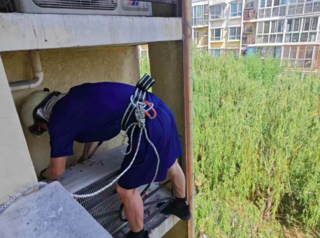 收到居民反馈,马坊社区工作人员立即入户查看。鸽子窝位于4层空调外机与楼体外墙的夹缝中,需要专业人士在窗外高空作业,处理起来难度不小。