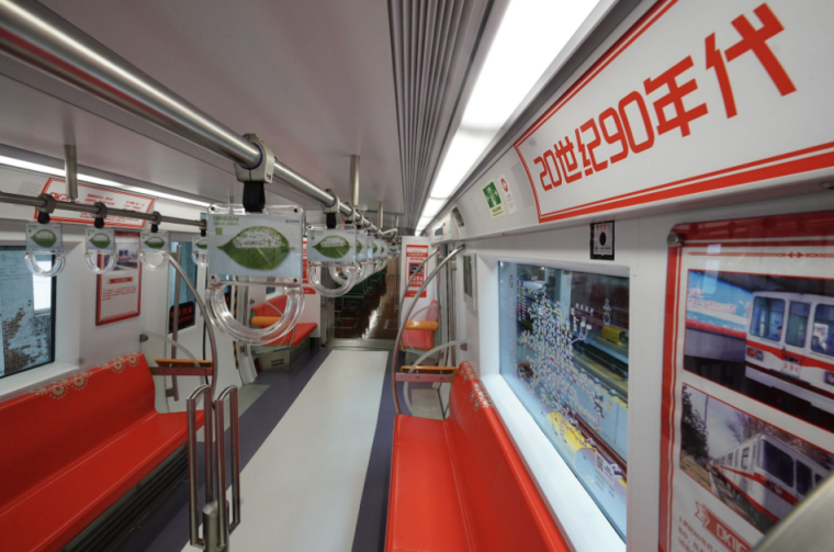 从列车两端往中间走,便穿越到了上世纪80年代与90年代。白色的车体采用了红色线条涂装,车厢内红色的塑料座椅调整为纵向布局,提高了列车的载客量。