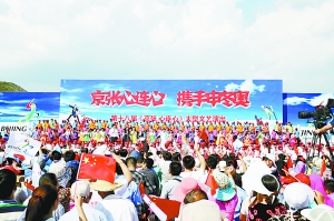 京张两地人民共同期盼奥运的热情正不断升温。7月16日,北京电视台“心连心”艺术团大型文艺演出在张家口崇礼县举行。文艺演出围绕“京张心连心 携手盼奥运”主题,演出历时两个小时,集中展示了15个精品节目。节目形式丰富多样,包含歌舞、器乐演奏、民俗演绎等,再现了雪都崇礼优良的生态环境以及滑雪旅游所取得的成就。