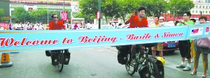 在1.25万公里的骑行过程中,这两位探险家全部的家当是两辆自己组装的自行车、一个帐篷、一部定位系统、几个背包等。Basile告诉记者,他从小喜欢游泳和骑行,上学期间曾和朋友骑车环游过法国,并萌生了要骑车去东方的想法,“因为这个更具挑战性”。为实现这个梦想,此前是工程师的Simon辞去了工作,与刚刚拿下物理博士学位的中学同学Basile一起完成这项探险。说到此次探险历程,Simon直言其实比想象中的安全。在骑行过程中,一些同样的爱好者会陪他们走一程,有的时候还会得到好心人馈赠的物资。而每到一处,他们都会记下当地的风土人情。虽然到达北京当天两位探险家胡茬满脸,略显落魄,不过,Simon向记者表示,骑行7个月,体重非但没有减轻,反而还有所增加。