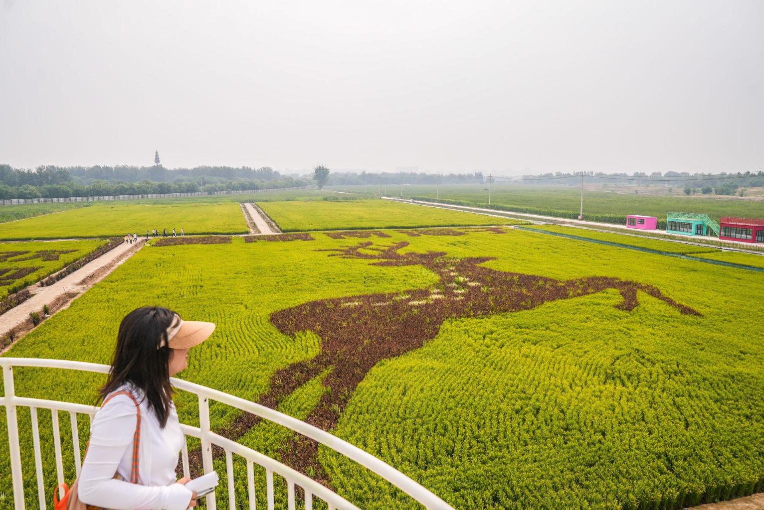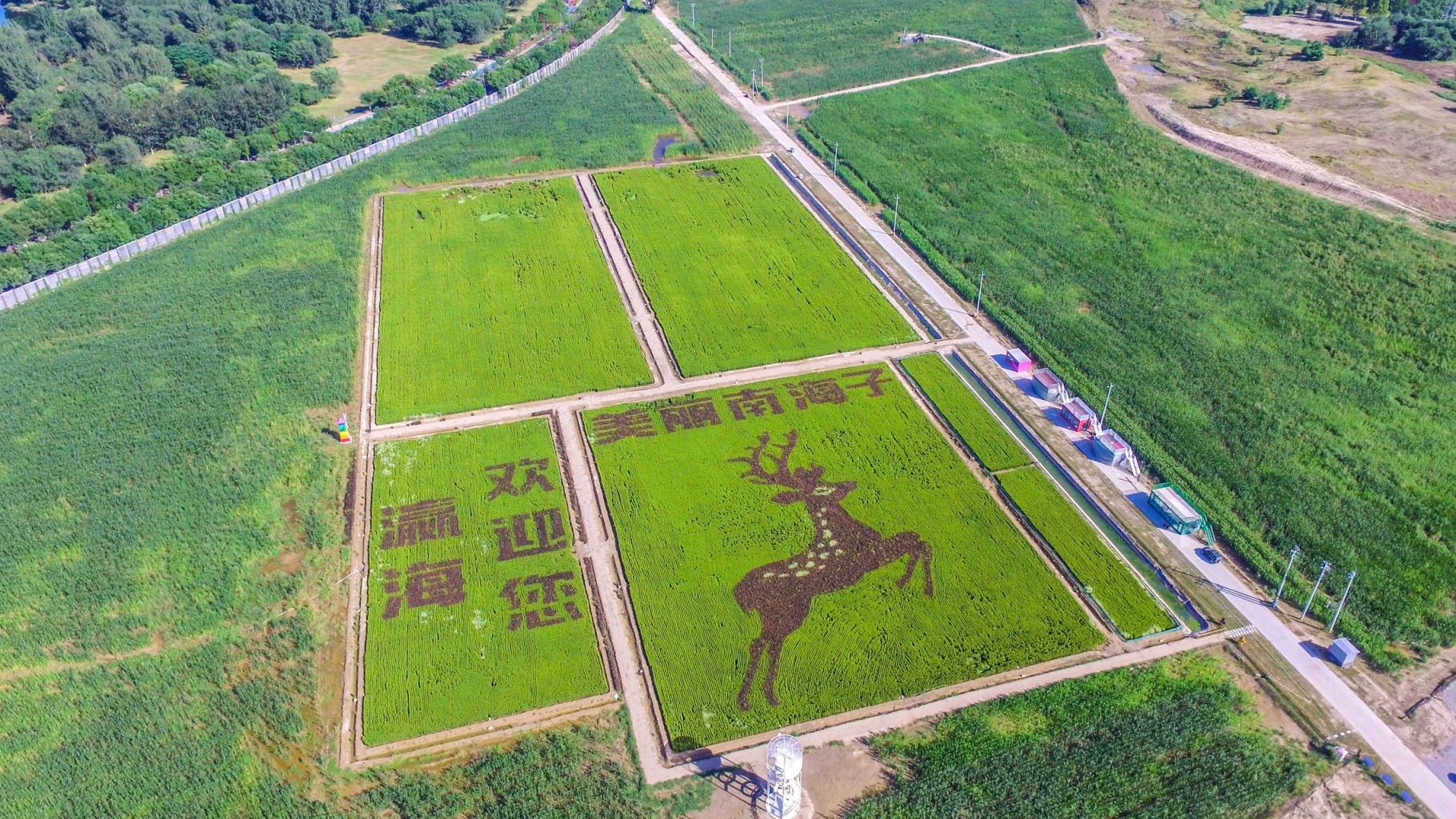 在红星医院附近,瀛海镇今年还恢复了50亩稻田,它的特别之处在于,种植人员通过对红色胭脂稻、绿色海育7233、白色海稻86等不同品种的巧妙组合,在大地上画出了一幅美丽的稻田画——昂首挺胸的麋鹿身旁,分别是“瀛海欢迎您”“美丽南海子”两组大字。这幅稻田画旁边已经建起了观景台,供游人免费参观。