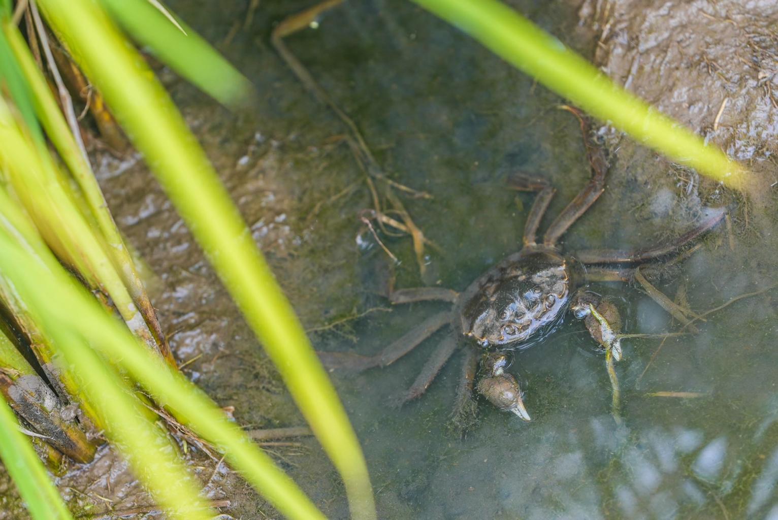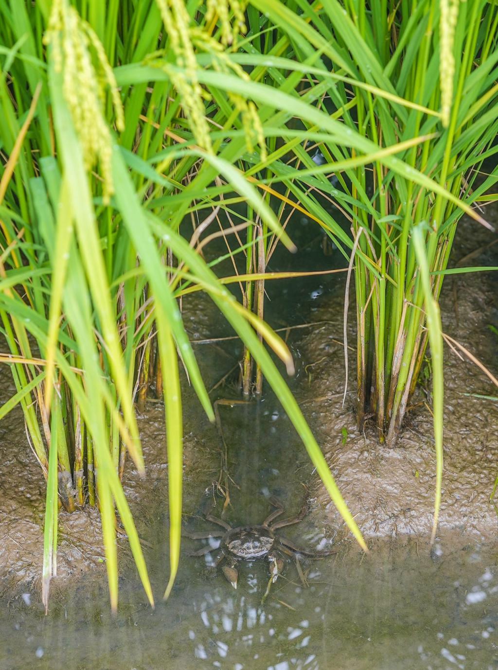 眼前200多亩水稻,绿油油一望无际。细观察,这一大片地被人为划分成了几小块,每一块的地头,还立着牌子,上面有“螃蟹”“小龙虾”“鱼”的字样和图案。再低头看看,嘿!这些小家伙儿正在稻田里活动呢,看到人来,胆小的会潜入水中,胆大的被记者的镜头成功捕捉。
